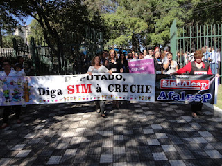 Foi excelente a manifestação realizada hoje na Assembleia Legislativa do Estado de São Paulo, no Parque do Ibirapuera, pela manutenção da Creche daquela Casa (que existe há 34 anos). Organizado pelo Conselho de Pais e Mães, o ato contou com o total apoio da ASPAL, da AFALESP e do SINDALESP, além dos deputados Adriano Diogo, Carlos Giannazzi e Major Olímpio Gomes.